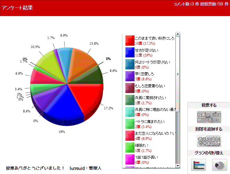 おっかなびっくりでしたがアンケートやって良かったと心底思いました!!うおおおおおお!!こんなんですが是非とも今後も良しなにして頂けたらこれ幸いです。